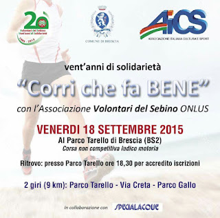 BRESCIA - Corri che fa bene - Non competitiva AICS di km 9 (2 giri) - Ritrovo ore 18,30 - Partenza ore 20,00 da Parco Tarello, Brescia Due